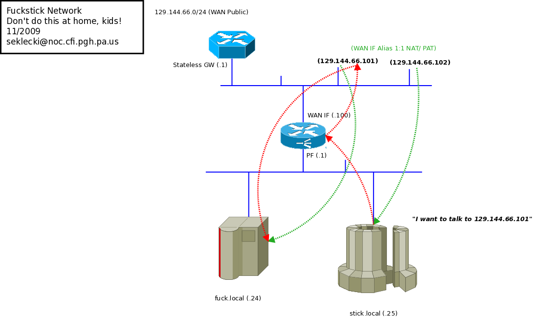 On Tue, 2009-11-24 at 11:25 -0800, Brian Buhrow wrote: > Hello. Each box has an internal and external address. > So, for example, I have two boxes: > 192.168.25.2 and 192.168.25.4 > Each have external addresses: > 157.22.25.2 and 17.22.25.4 > (These are theo See attached diagrams. I think your customer is very very confused about TCP/IP, but anyway. It _may_ work. It may. Or we could make it work. Just so long as: 1) The outbound NAT+PAT (this is important) address for internal client TCP connections to the WAN is a *DIFFERENT SOURCE WAN* address, such as the WAN IF, the CARP IF, or another IP (.99), in the WAN subnet, than that of the 1:1 mapping for the public->private address maps. You're essentially talking about double-NAT within the device, and some exotics POS routers may make that work (Sonicwall comes to mind) Tell the customer they can have anything they want, as long as they're willing to pay for it. ~BAS