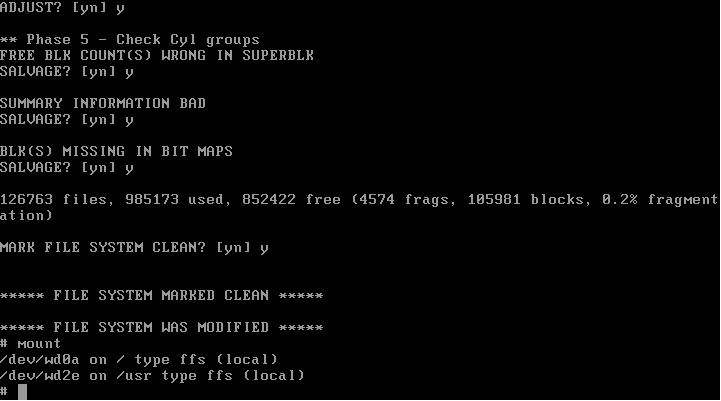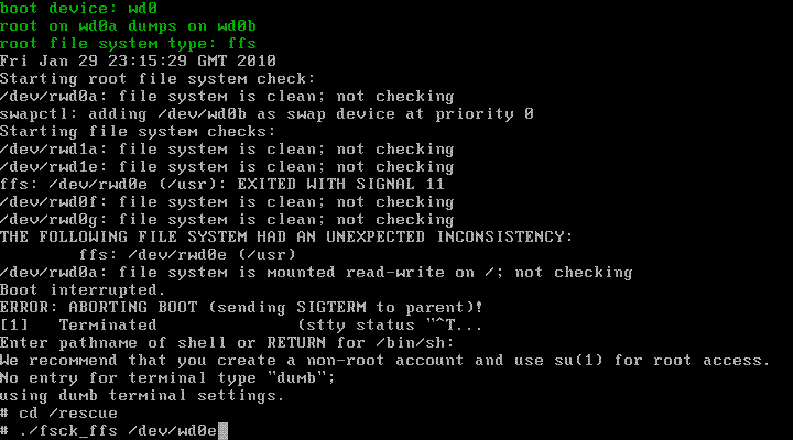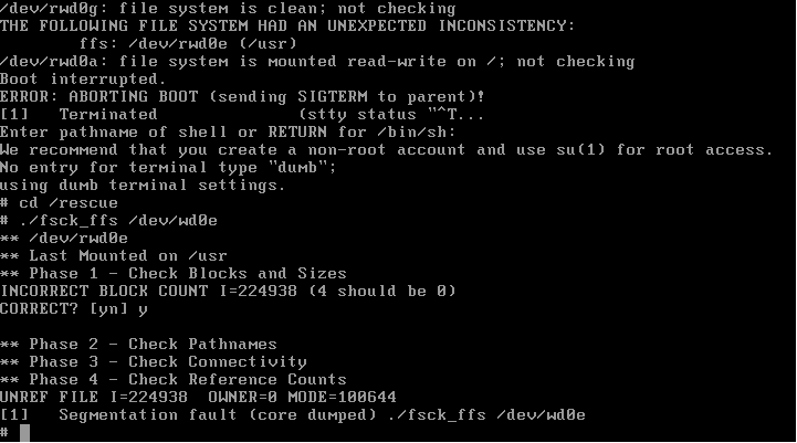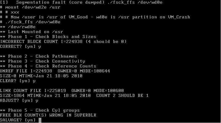 > On Fri, 29 Jan 2010, "Eduardo Horvath" <eeh%NetBSD.org@localhost> wrote: >> SO...seems maybe fsck_ffs needs something in /usr when it finds issues >> and pukes when it can't find it? > > I wonder if it has something to do with shared libs. Can you try > /rescue/fsck_ffs ? /rescue/fsck_ffs behaves EXACTLY the same. Without /usr mounted it dies (see screenshot below) With /usr mounted it fixes the crippled partition (two screeshots for this) I've also included a screen shot of the multi-user boot failure message... Why would /usr influence /rescue/fsck_ffs? --gene