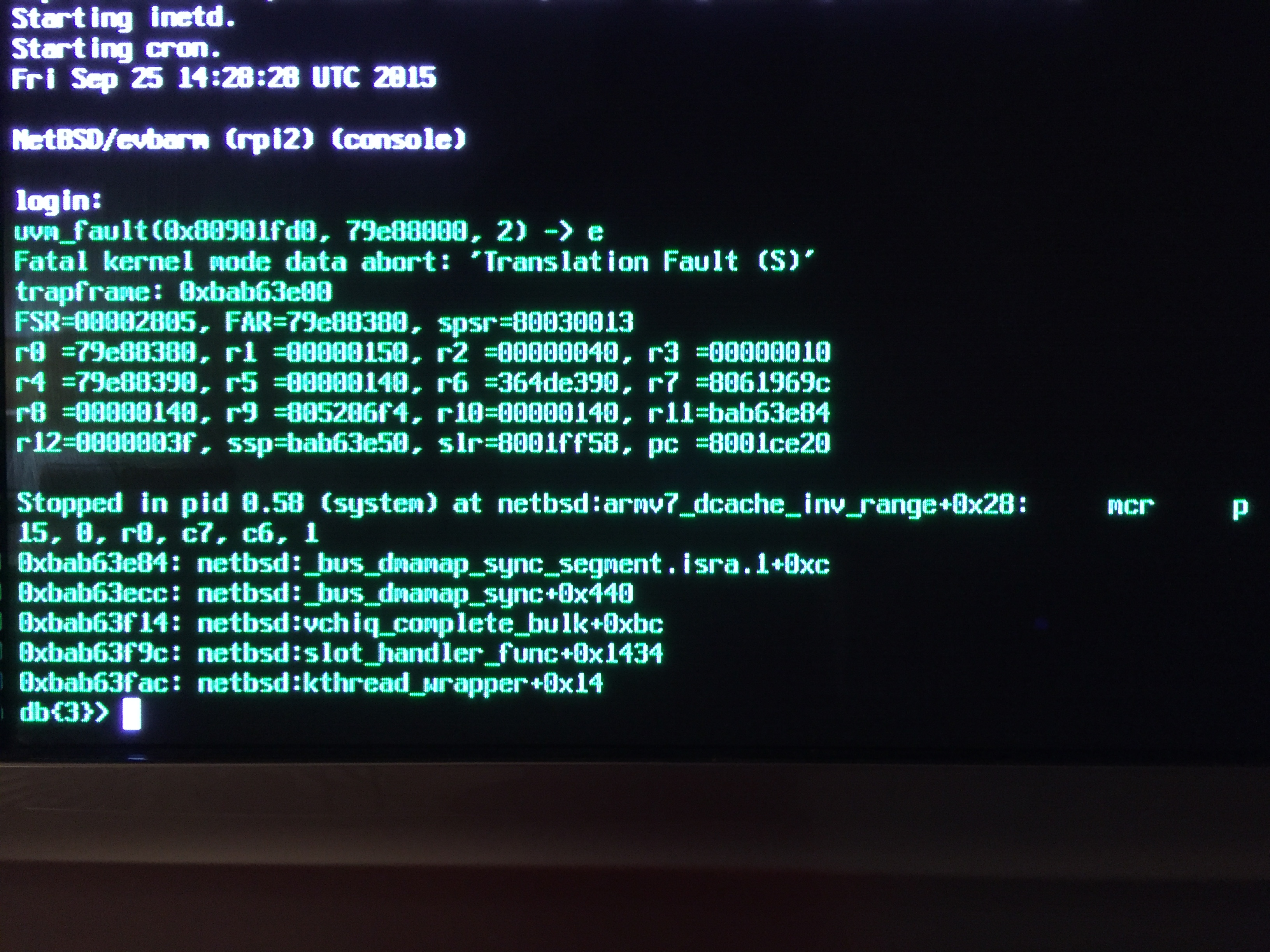 >> DDB comes up and says the kernel is stopped in pid 0.58 at netbsd: armv7_dcache_inv_range+0x28 (mcr p)
