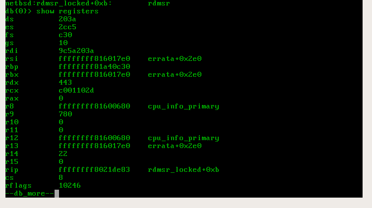 cpuctl identify 0 on 8.0 : cpu0: highest basic info 0000000d cpu0: highest extended info 8000001e cpu0: "AMD Ryzen 5 2600X Six-Core Processor " cpu0: AMD Family 17h (686-class), 3593.91 MHz cpu0: family 0x17 model 0x8 stepping 0x2 (id 0x800f82) cpu0: features 0x178bfbff<FPU,VME,DE,PSE,TSC,MSR,PAE,MCE,CX8,APIC,SEP,MTRR,PGE> cpu0: features 0x178bfbff<MCA,CMOV,PAT,PSE36,CLFLUSH,MMX,FXSR,SSE,SSE2,HTT> cpu0: features1 0x5ed82203<SSE3,PCLMULQDQ,SSSE3,CX16,SSE41,SSE42,MOVBE,POPCNT> cpu0: features1 0x5ed82203<AES,XSAVE,OSXSAVE,AVX,RDRAND> cpu0: features2 0x2bd3fb7f<SYSCALL/SYSRET,NOX,MMXX,MMX,FXSR,FFXSR,RDTSCP,LONG> cpu0: features3 0x1f3<LAHF,CMPLEGACY,ALTMOVCR0,LZCNT,SSE4A,MISALIGNSSE> cpu0: features3 0x1f3<3DNOWPREFETCH> cpu0: features5 0x840021<FSGSBASE,AVX2,RDSEED,CLFLUSHOPT> cpu0: xsave features 0x7<x87,SSE,AVX> cpu0: xsave area size: current 832, maximum 832, xgetbv enabled cpu0: enabled xsave 0x7<x87,SSE,AVX> cpu0: I-cache 64KB 64B/line 4-way, D-cache 32KB 64B/line 8-way cpu0: L2 cache 512KB 64B/line 8-way cpu0: L3 cache 16MB 64B/line 16-way cpu0: ITLB 64 4KB entries fully associative, 64 2MB entries fully associative cpu0: DTLB 64 4KB entries fully associative, 64 2MB entries fully associative cpu0: L2 ITLB 1024 4KB entries 8-way, 1024 2MB entries 8-way cpu0: L2 DTLB 1536 4KB entries 8-way, 1536 2MB entries 2-way cpu0: L1 1GB page ITLB 64 1GB entries fully associative cpu0: L1 1GB page DTLB 64 1GB entries fully associative cpu0: Initial APIC ID 0 cpu0: AMD Power Management features: 0x0 cpu0: UCode version: 0x6000626 "show registers" in DDB output is attached. On Wed, May 1, 2019 at 4:29 PM <maxv%netbsd.org@localhost> wrote: > > Synopsis: kernel crashes with amd64 CURRENT iso in virtualbox > > State-Changed-From-To: open->feedback > State-Changed-By: maxv%NetBSD.org@localhost > State-Changed-When: Wed, 01 May 2019 13:29:08 +0000 > State-Changed-Why: > Please provide the output of "show registers" in DDB, and also "cpuctl identify 0" from NetBSD 8.0 > > >