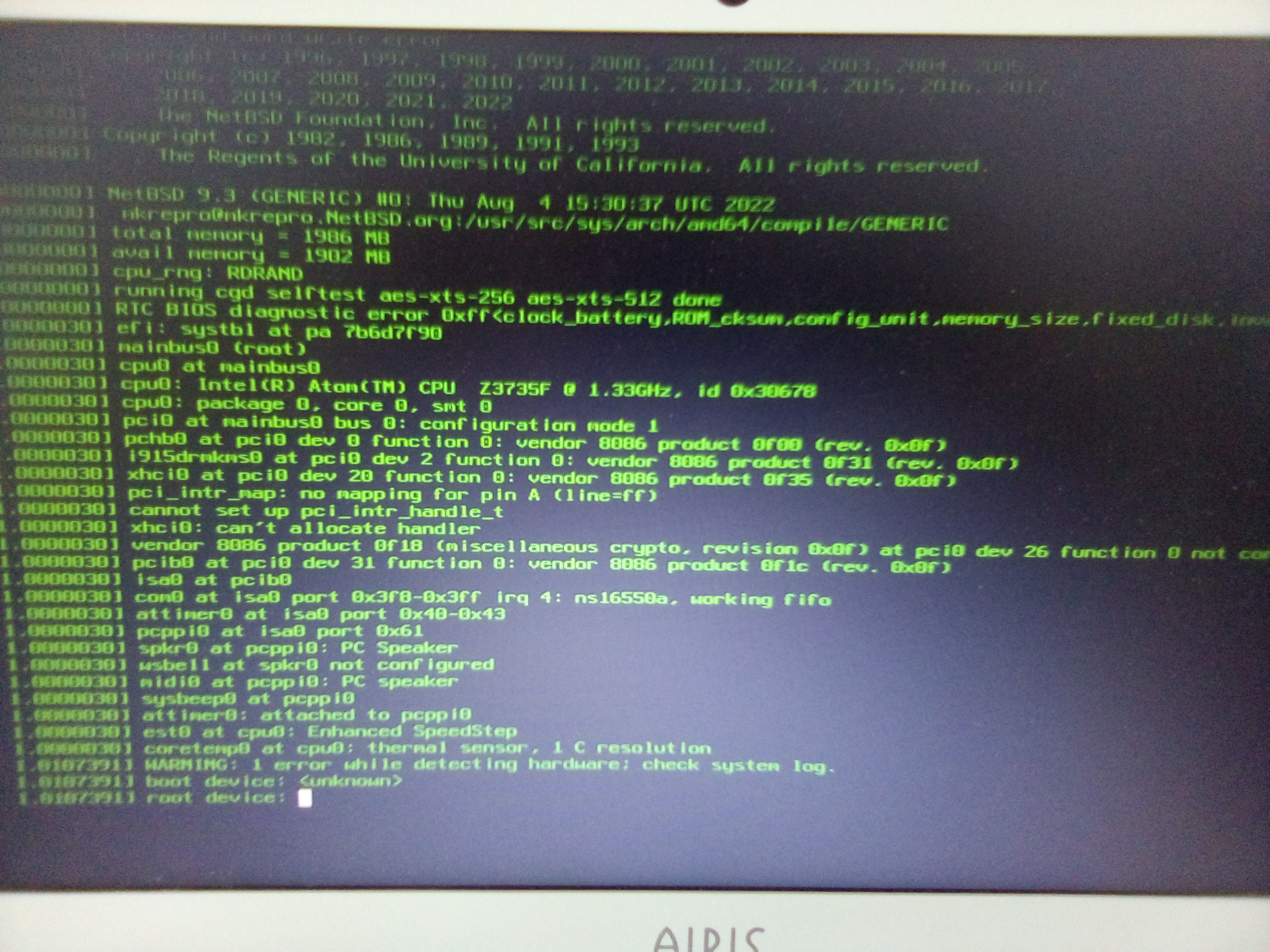 The following reply was made to PR install/57542; it has been noted by GNATS. From: Taylor R Campbell <riastradh%NetBSD.org@localhost> To: lehmannwer%gmail.com@localhost Cc: gnats-bugs%NetBSD.org@localhost Subject: Re: install/57542: NetBSD shuts down during installation on Intel Atom Baytrail Notebook with 32-bit EFI Date: Wed, 26 Jul 2023 13:20:01 +0000 When you say `what seems to be a clean shutdown', what exactly do you mean?What output does it display? Does it shut down, or does it reboot? If it reboots, can you enter a utility shell when it comes back up,and get the output of dmesg, and share it? With any luck, it will have the previous boot's dmesg in it.If it doesn't reboot, can you at least share dmesg from the utilityshell, even though it won't have the previous boot's dmesg?