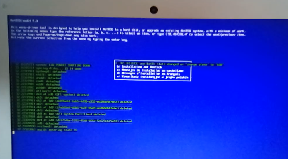 To boot with ACPI disabled, interrupt the menu and enter the NetBSD boot prompt. Type boot -2 to boot with ACPI disabled.")