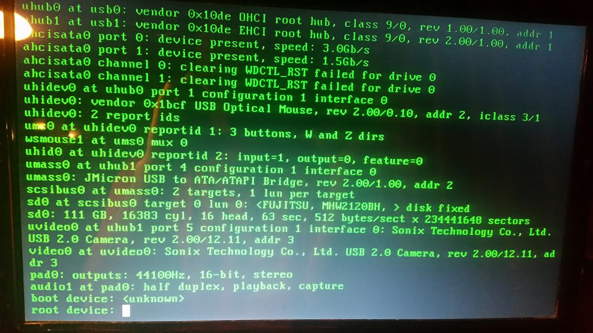 No, this happened when the installation CD was loading. I've had exactly the same problem in the installation process last year, see attachment. 2016-09-10 2:49 GMT+03:00 Michael van Elst <mlelstv%serpens.de@localhost>: > swiftgriggs%gmail.com@localhost (Swift Griggs) writes: > >>I wonder what happened in his case. I can tell he's re-using the same box >>and drive from his FreeBSD install, but I've done that many times and >>never had a problem (other than being annoyed at 'dk' devices showing up). >>I just wipe the disk and start over. > > Well, he didn't wipe the disk and either he just didn't recognize > "root device:" as a prompt for input or, more probable, the keyboard > driver (USB?) failed. > > But neither should happen during installation. My guess is that sysinst > didn't clean the disk and the screenshot comes from booting the installed > system. > > > -- > -- > Michael van Elst > Internet: mlelstv%serpens.de@localhost > "A potential Snark may lurk in every tree."