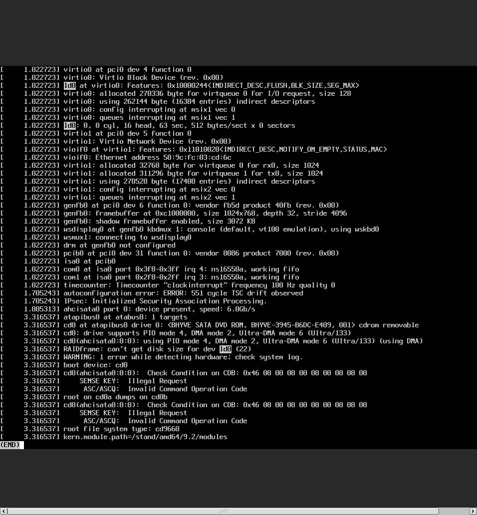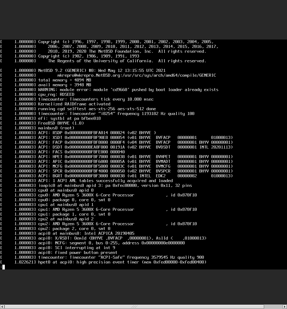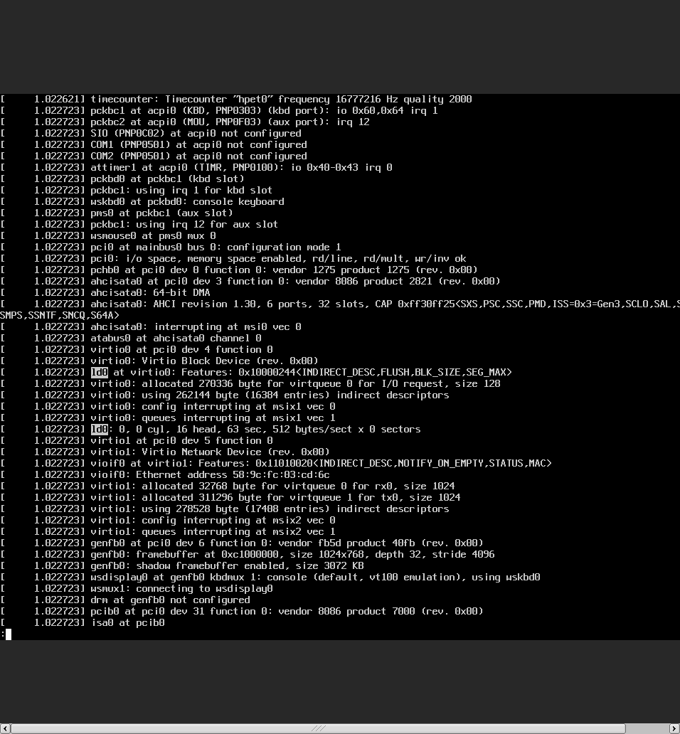 On Sun, Apr 17, 2022 at 07:43:00AM -0400, Greg Troxel wrote: > I would look at the bhyve logs, and see if you can turn on debugging. > It looks like the within-VM system (domU in xen terms) is accessing the > disk, but the hypervisor is seeing the accesses as malformed or > erroneous. I'm using vm-bhyve. I've turn on debugging but no logs in debug log. > I would also suggest booting single user and trying dd in the utility > menu, both reading from and writing to the virtual disk. I did zero writing to the disk after exit from installer. Result: # dd if=/dev/zero of=/dev/ld0 bs=1M count=1 dd: /dev/ld0: end of device 1+0 records in 0+0 records out 0 bytes transferred in 0.001 secs (0 bytes/sec) > Also, look at how the disk attaches, in dmesg. Often there are pciide > controllers, and ahcisata, or various other kinds, and it may be that > bhyve provides multiple options and some work and some don't and > disabling the non-working one would be a workaround. I attach full dmesg image. I'm investigating about vm-bhyve disk option... > It seems overwhelmingly likely that there is a bug in NetBSD or bhyve, > but really hard to say which. I suspect the bhyve people would be > interested in looking into this and would suggest asking there, but if > you can get a well-documented and more minimal failure case, I bet that > would help greatly. OK, I'd ask a question to bhyve relation mailing list. > > In addition, the following image boot fine. So it may install image > > specific issue. > > > > - FreeBSD-13.0-RELEASE-amd64-memstick.img (from FreeBSD official) > > - NetBSD-9.2-amd64.iso (from https://cdn.netbsd.org/pub/NetBSD/NetBSD-9.2/images/) > > But after you boot the 9.2 iso, can you read/write to the disk? No. I tried to proceed installation through the ISO but `gpt create` command failed when disk partitioning. I entered to shell then run gpt manually: # gpt create -p 128 ld0 gpt: /dev/rld0: Media size can't be 0 -- Yuuki Enomoto <uki%e-yuuki.org@localhost> B684 4BF2 9CD4 961F 510A 8121 7B4D FF44 2348 20B8