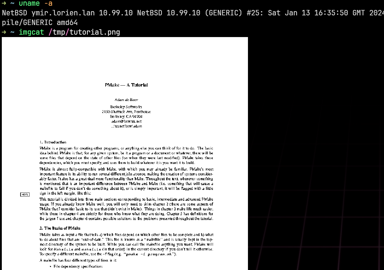 On Mon, 15 Jan 2024 at 21:48, Ivan "Rambius" Ivanov <rambiusparkisanius%gmail.com@localhost> wrote: > > Hello, > > I am experimenting with groff and troff on NetBSD. I am able to > generate a postscript file and view it with the following commands > > groff -ms -Tps test.ms > test.ps > gs test.ps > > Is there a way to render groff / troff's output directly to the > terminal similar to the way man outputs to the terminal? Well, you could try converting the postscript output to .png using $ gs -dNOPAUSE -q -sDEVICE=png256 -sOutputFile=/tmp/whatever.png /tmp/whatever.ps then, provided you use a terminal emulator capable of sixel display, install imgcat using pip3 install imgcat (obviously, python3 + a bunch of libraries required, they are available in pkgsrc, but I haven't seen imgcat itself; however, it works for me on my -current system, using WezTerm from a W11 laptop...) > > Regards > rambius > > -- > Tangra Mega Rock: http://www.radiotangra.com Chavdar Ivanov -- ----