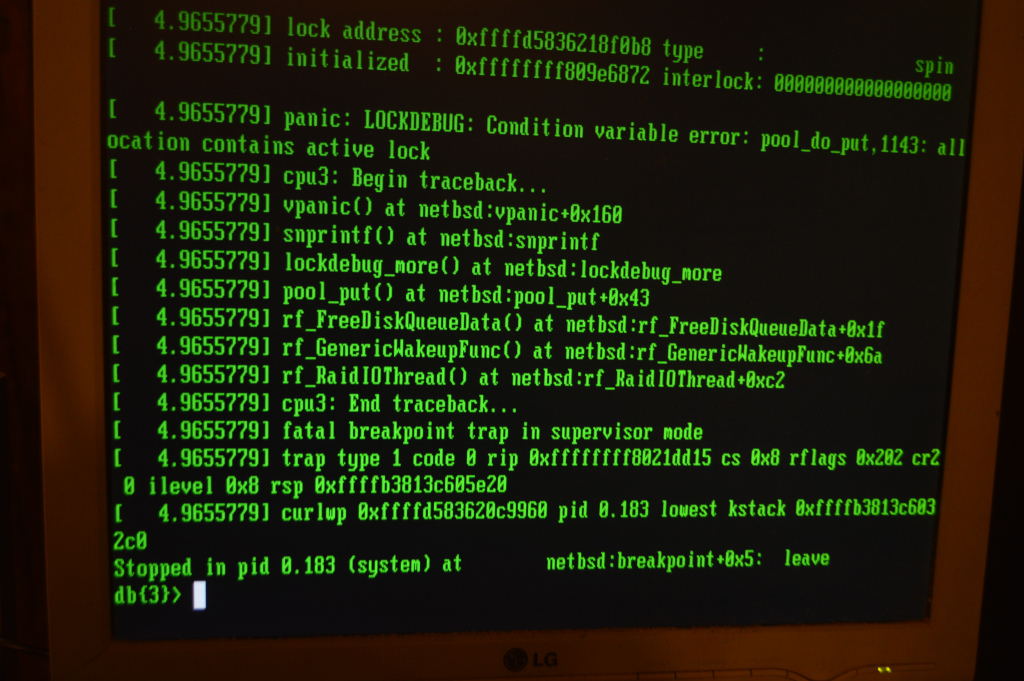 SAITOH Masanobu a écrit : > On 2021/12/09 22:05, BERTRAND Joël wrote: >> SAITOH Masanobu a écrit : >>> I think it would worth to try LOCKDEBUG. >> >> I have tried, but a kernel built with LOCKDEBUG panics during boot >> (very early). > > Please show the panic message. Photo in attachment. Best regards, JB